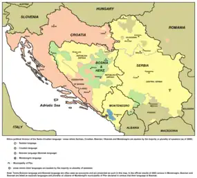 Le bosnien devient langue officielle[40] et on élabore son standard. Les linguistes qui le font cherchent à le différencier des autres standards surtout en recommandant les synonymes d’origine turque, arabe et persane qui existent dans la langue pour les mots d’origine slave. La constitution du Monténégro, indépendant depuis 2006, stipule que la langue officielle du pays est le monténégrin[41], avec son propre standard. Celui-ci inclut des traits spécifiques communs à tous les parlers du Monténégro et des traits de la langue de la littérature monténégrine d’avant la réforme de Karadžić[42].