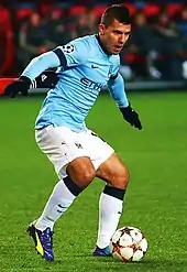 Le , le club anglais de Manchester City recrute Agüero contre un chèque d'environ 45 millions d'euros[41]. Il marque lors de son premier match avec le maillot mancunien face à Swansea City (4-0). Lors de cette rencontre, l'ancien colchoneros réalise une prestation de très haut niveau qui lui vaut la distinction d'Homme du match, auteur d'un doublé (dont une frappe croisée des 30 mètres) et d'une passe décisive à David Silva[42]. Avec l'accord de la ligue anglaise, l'Argentin évolue à City avec un maillot floqué de son surnom "Kun", comme dans ses précédents clubs[43].