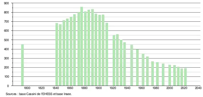 L'évolution du nombre d'habitants est connue à travers les recensements de la population effectués dans la commune depuis 1793. Pour les communes de moins de 10 000 habitants, une enquête de recensement portant sur toute la population est réalisée tous les cinq ans, les populations légales des années intermédiaires étant quant à elles estimées par interpolation ou extrapolation[15]. Pour la commune, le premier recensement exhaustif entrant dans le cadre du nouveau dispositif a été réalisé en 2006[16].