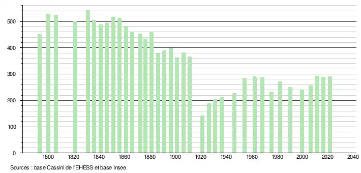 L'évolution du nombre d'habitants est connue à travers les recensements de la population effectués dans la commune depuis 1793. Pour les communes de moins de 10 000 habitants, une enquête de recensement portant sur toute la population est réalisée tous les cinq ans, les populations légales des années intermédiaires étant quant à elles estimées par interpolation ou extrapolation[24]. Pour la commune, le premier recensement exhaustif entrant dans le cadre du nouveau dispositif a été réalisé en 2006[25].