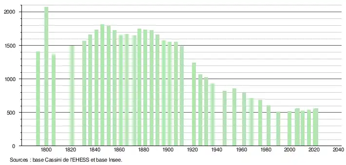 L'évolution du nombre d'habitants est connue à travers les recensements de la population effectués dans la commune depuis 1793. Pour les communes de moins de 10 000 habitants, une enquête de recensement portant sur toute la population est réalisée tous les cinq ans, les populations légales des années intermédiaires étant quant à elles estimées par interpolation ou extrapolation[25]. Pour la commune, le premier recensement exhaustif entrant dans le cadre du nouveau dispositif a été réalisé en 2005[26].