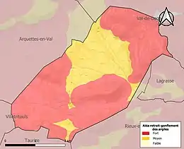 Le retrait-gonflement des sols argileux est susceptible d'engendrer des dommages importants aux bâtiments en cas d’alternance de périodes de sécheresse et de pluie. La totalité de la commune est en aléa moyen ou fort (75,2 % au niveau départemental et 48,5 % au niveau national). Sur les 186 bâtiments dénombrés sur la commune en 2019, 186 sont en aléa moyen ou fort, soit 100 %, à comparer aux 94 % au niveau départemental et 54 % au niveau national. Une cartographie de l'exposition du territoire national au retrait gonflement des sols argileux est disponible sur le site du BRGM[25],[Carte 3].