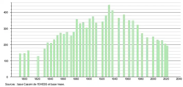 | L'évolution du nombre d'habitants est connue à travers les recensements de la population effectués dans la commune depuis 1793. Pour les communes de moins de 10 000 habitants, une enquête de recensement portant sur toute la population est réalisée tous les cinq ans, les populations légales des années intermédiaires étant quant à elles estimées par interpolation ou extrapolation[27]. Pour la commune, le premier recensement exhaustif entrant dans le cadre du nouveau dispositif a été réalisé en 2008[28]. En 2021, la commune comptait 193 habitants[Note 6], en diminution de 15,72 % par rapport à 2015 (Aude : +2,47 %, France hors Mayotte : +1,84 %). |