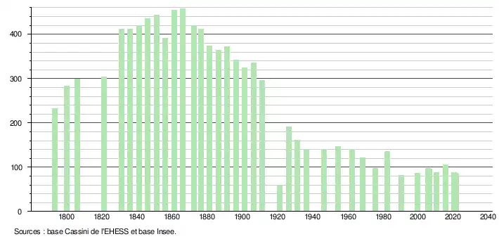 L'évolution du nombre d'habitants est connue à travers les recensements de la population effectués dans la commune depuis 1793. Pour les communes de moins de 10 000 habitants, une enquête de recensement portant sur toute la population est réalisée tous les cinq ans, les populations légales des années intermédiaires étant quant à elles estimées par interpolation ou extrapolation[16]. Pour la commune, le premier recensement exhaustif entrant dans le cadre du nouveau dispositif a été réalisé en 2005[17].
