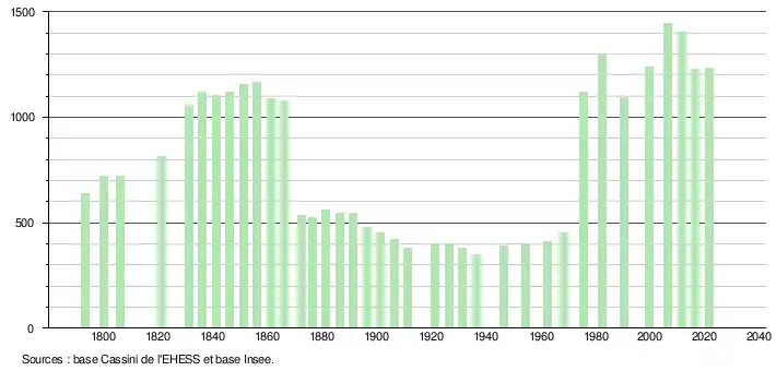 L'évolution du nombre d'habitants est connue à travers les recensements de la population effectués dans la commune depuis 1793. Pour les communes de moins de 10 000 habitants, une enquête de recensement portant sur toute la population est réalisée tous les cinq ans, les populations légales des années intermédiaires étant quant à elles estimées par interpolation ou extrapolation[22]. Pour la commune, le premier recensement exhaustif entrant dans le cadre du nouveau dispositif a été réalisé en 2006[23].
