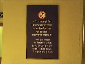 On pense que l'avortement sélectif selon le sexe et l'infanticide faussent considérablement le ratio naturel dans certaines populations, comme la Chine, où l'introduction de l'échographie à la fin des années 1980 a conduit à un sex-ratio à la naissance (hommes/femmes) de 1,181 (2010 données de recensement pour la Chine)[42]. Le recensement indien de 2011 rapporte le sex-ratio de l'Inde dans la tranche d'âge de 0 à 6 ans à 1,088[43]. Les rapports de masculinité à la naissance de 2011 pour la Chine et l'Inde sont nettement supérieurs au rapport moyen enregistré aux États-Unis de 1940 à 2002 (1,051) ; cependant, leurs rapports de masculinité à la naissance se situent dans la fourchette de 0,98 à 1,14 observée aux États-Unis pour des groupes ethniques importants au cours de la même période[23]. :10Outre les pays asiatiques, un certain nombre de pays d'Europe, du Moyen-Orient et d'Amérique latine ont récemment signalé des rapports de masculinité à la naissance élevés, de l'ordre de 1,06 à 1,14. Selon certains, des rapports de masculinité élevés à la naissance pourraient être dus en partie à des facteurs sociaux.