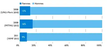 Cette tendance est confirmée avec l’enquête générale de la fondation auprès de la communauté en 2011, qui trouve une proportion de femmes à 9 % au niveau mondial et 15 % aux États-Unis[4],[5]. Une autre étude dirigée par Judd Antin et publiée la même année examine les genres déclarés des comptes enregistrés sur Wikipédia en anglais, et trouve une proportion de 82 % d’hommes et 18 % de femmes[6]. La même année, une équipe de recherche dirigée par Nicolas Jullien trouve des résultats similaires auprès des personnes contribuant à Wikipédia en français, avec 80 % d’hommes, et 86 % chez les personnes contribuant régulièrement[7]. Cette proportion semble stable dans le temps[8].