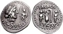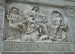 Les liens entre la reproduction humaine, la prospérité générale et le bien-être de l'État est incarné par le culte de Vénus, qui diffère de sa contrepartie grecque Aphrodite dans son rôle de mère du peuple romain à travers son fils demi-dieu Énée[31]. Durant la guerre civile des années -80, Sylla, en passe d’envahir son propre pays avec les légions sous son commandement, fait battre des pièces montrant une Vénus couronnée comme divinité tutélaire personnelle, avec Cupidon tenant la palme de la victoire ; au verso, les trophées militaires côtoient les augures, les prêtres d'État qui lisent la volonté des Dieux. L'iconographie lie les divinités de l’amour et du désir avec le succès militaire et l’autorité religieuse ; Sylla adopte le titre Epaphroditus, celui d'Aphrodite, avant de devenir dictateur.[32] Le fascinum, un charme phallique, est omniprésent dans la culture romaine, apparaissant partout, depuis les bijoux jusqu'aux cloches ou aux lampes[Williams 1], également dans des amulettes protégeant les enfants[33] ou lors des triomphes[34].