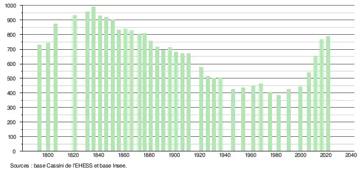 L'évolution du nombre d'habitants est connue à travers les recensements de la population effectués dans la commune depuis 1793. Pour les communes de moins de 10 000 habitants, une enquête de recensement portant sur toute la population est réalisée tous les cinq ans, les populations légales des années intermédiaires étant quant à elles estimées par interpolation ou extrapolation[15]. Pour la commune, le premier recensement exhaustif entrant dans le cadre du nouveau dispositif a été réalisé en 2006[16].