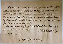 Certains exemplaires de The Easy Instructor, Part II (1803) présentent une déclaration au verso de la page de titre, dans laquelle John Connelly (dont le nom est parfois épelé Conly, Connolly et Coloney) accorde la permission à Little et Smith de faire usage dans leurs publications des shape notes dont il revendique les droits [9],[10]. Little et Smith n’ont pas cherché à obtenir les droits de l’invention pour eux-mêmes, mais ont déclaré à la place que ces notes avaient été inventées vers 1790 par John Connelly de Philadelphie, Pennsylvanie. Andrew Law prétendit être l’inventeur des shape notes.