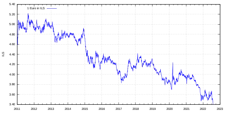 Le shekel est librement convertible depuis le . Au , un shekel valait 0,192 4 € et 1 € valait 5,197 8 shekalim (depuis cette date, 1 € fluctue autour de plus ou moins 4 shekalim). Au , l'euro vaut 4,050 7 shekalim [13]. Le dollar américain est aussi utilisé officieusement en Israël, à cause des variations du cours du shekel.