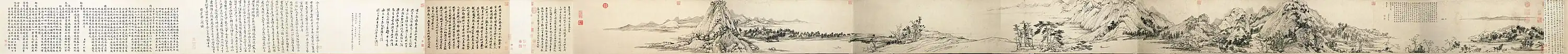 - Paysages et poèmes, encre et couleur sur papier, cinq feuilles d'album montées en rouleau en longueur et signées, deux colophons dont un de Wen Zhengming.