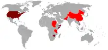 Cartes des pays opérateurs actuels (en rouge) et anciens (en bordeau) du chasseur J-5. Les États-Unis sont indiqués car plusieurs sont possédés par des particuliers.