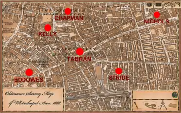 Pour déterminer le quartier de résidence du tueur, le détective utilise une carte de Whitechapel qu'il complète petit à petit avec les différents éléments à sa disposition, de manière à cercler le plus précisément possible la zone d'habitation du meurtrier.