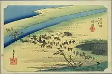 La classique estampe ukiyoe d'Ando Hiroshige (édition Hoeido) de 1831-1834 montre des voyageurs traversant les bas-fonds et bancs de sable de la rivière. Certains sont à pied, d'autres portés par des serviteurs et d'autres enfin dans des kago.