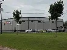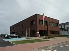 La marina de Shippagan avec, en arrière-plan, de gauche à droite, le port de pêche, le centre sportif et le collège | ||