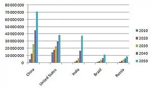 Alors qu'on estimait que la Chine ne pourrait devenir la première puissance économique mondiale qu'aux alentours de 2050, certains analystes s'étaient penchés désormais sur 2015, date à laquelle il était prévu que la Chine dépasse les États-Unis quant au PIB à parité de pouvoir d'achat. Selon ce même critère, la Chine est devenue en 2014 la première puissance mondiale.