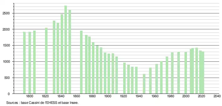 L'évolution du nombre d'habitants est connue à travers les recensements de la population effectués dans la commune depuis 1793. Pour les communes de moins de 10 000 habitants, une enquête de recensement portant sur toute la population est réalisée tous les cinq ans, les populations légales des années intermédiaires étant quant à elles estimées par interpolation ou extrapolation[25]. Pour la commune, le premier recensement exhaustif entrant dans le cadre du nouveau dispositif a été réalisé en 2008[26].