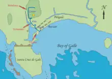 Le fort portugais de Santa Cruz de Gale était situé sur un promontoire à l'extrémité ouest de la baie de Galle. Bien que considérablement élevé à son extrémité sud, il s'est progressivement incliné vers l'isthme où il se connectait au continent. À cet isthme, un mur s'étendait du côté de la mer au côté de la baie entourant la ville de Galle. Il y avait trois bastions défendant le mur de la mer à la baie appelés Santo António, Conception et Santiago. Santiago était petite et avait une terrasse basse ouverte, ce qui la rendait vulnérable aux attaques à la grenade. Du Santiago, un mur de parapet courait le long de la baie jusqu'à la Retraite, une fortification qui contenait le donjon du capitaine et une esplanade, qui avait de la place pour monter 20 canons[58].