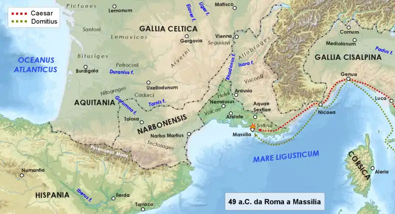 César décide de porter la lutte contre ses adversaires en Hispanie citérieure (Espagne), mais ne disposant pas de flotte, il gagne l'Espagne par la voie terrestre. En chemin, il se heurte à l'opposition de l’importante cité maritime.