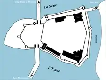 - le château qui occupe la pointe se trouvant au confluent de la Seine et de l'Yonne. Il contrôle les ponts enjambant les deux fleuves et entouré d'eau de tous côtés grâce au confluent et un fossé mouillé sur sa face Est. Toute la péninsule est alors ceinturée de murs jalonnés de tours. Au milieu de cet espace se trouve le grand donjon carré du XIIe siècle;