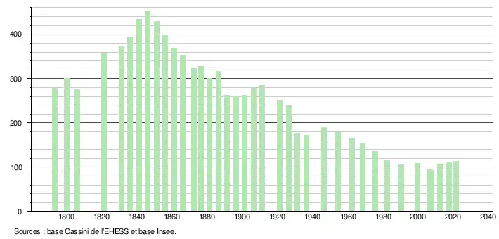 L'évolution du nombre d'habitants est connue à travers les recensements de la population effectués dans la commune depuis 1793. Pour les communes de moins de 10 000 habitants, une enquête de recensement portant sur toute la population est réalisée tous les cinq ans, les populations légales des années intermédiaires étant quant à elles estimées par interpolation ou extrapolation[33]. Pour la commune, le premier recensement exhaustif entrant dans le cadre du nouveau dispositif a été réalisé en 2007[34].