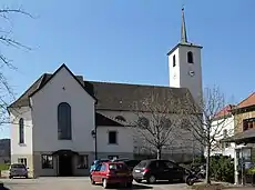 - L'église de la Vierge-Auxiliatrice[25]. À l'intérieur de la chapelle se trouve une statue de style baroque de Saint Séverin, elle date de 1716 et est en bois polychrome. Elle a été restaurée en 1983 par l'artiste peintre Louis Wiederkehr de Soultz[26]. La chapelle, consacrée à Marie-Auxiliatrice et achevée en 1966, a été construite bénévolement par les habitants. Les bénévoles venaient œuvrer à ce chantier de rénovation, dirigé par Léon Reitzer, dont la première pierre a été posée le .