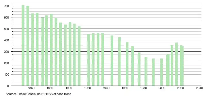 L'évolution du nombre d'habitants est connue à travers les recensements de la population effectués dans la commune depuis 1851. Pour les communes de moins de 10 000 habitants, une enquête de recensement portant sur toute la population est réalisée tous les cinq ans, les populations légales des années intermédiaires étant quant à elles estimées par interpolation ou extrapolation[23]. Pour la commune, le premier recensement exhaustif entrant dans le cadre du nouveau dispositif a été réalisé en 2005[24].