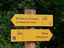- La signalétique extérieure de pédagogie à l'environnement que l'on trouve notamment dans les sites classés et les aires naturelles protégées, destinée à faciliter l'interprétation du paysage et du patrimoine[10] et de l'espace[11] et la découverte de la faune, flore, fonge ainsi que des écosystèmes ou services écosystémiques.