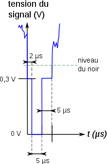 Les signaux de synchronisation produisent des pics vers le bas ou vers le haut, situés entre les tensions 0 V et 0,3 V, donc de valeur inférieure au niveau du noir.