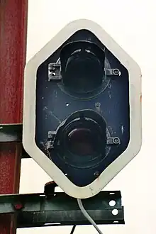 Les signaux, à un ou à deux feux, comportent une cible noire de forme caractéristique bordée d’une ligne blanche. Les feux sont équipés d’ampoules du type 85 V - 40 W, les huit ampoules allumées lors de l’occupation de la voie unique étant montées en série et alimentées en 600 V, tension de la caténaire. Ce système économe en câblage explique que seuls deux fils d’alimentation sont suspendus aux mats de la caténaire le long d’une voie unique.