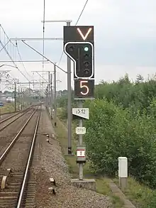![]() | Vert-jaune horizontal : autorise le passage en grand mouvement, mais le signal suivant impose une réduction de vitesse ; cette vitesse peut être indiquée par un nombre blanc affiché dans un écran inférieur ; à défaut, un nombre noir sur un triangle blanc peut être apposé sur le mât du signal : c'est la plus petite vitesse qui pourra être imposée par le signal suivant. Si aucune indication n'est présente, le conducteur considère que la vitesse imposée est de 40 km/h. | ![]() |