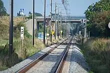| Panneau repère de fin de ligne de contact : indique la fin d'une zone alimentée par caténaire. Il impose l'arrêt aux engins de traction électriques. | |