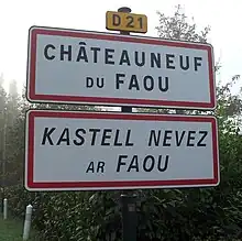 En Bretagne, la signalisation de localisation et de direction est souvent bilingue avec l'emploi du français et du breton à la fois. Elle a débuté dans le milieu des années 1980 et croît constamment depuis. Elle est particulièrement dense dans les départements de la Bretagne occidentale (Finistère, Morbihan et ouest des Côtes-d'Armor)[8]. À l'entrée de centaines de bourgs et de villes, des panneaux d'agglomérations indiquent le nom de la commune dans les deux formes (Par exemple Rennes/Roazhon ou Gwened/Vannes)[9]. En localisation, il existe également des panneaux bilingues, comme à la limite des départements, pour les rivières, les cols, etc. Outre les départements, les communes sont de plus en plus nombreuses à installer elles-mêmes une signalisation bilingue directionnelle ou sur des plaques de rue. Citons par exemple : Lorient, Brest, Carhaix-Plouguer, Pluguffan, Quimper, Pontivy, Vannes, Quimperlé, Lannion, Guingamp, Rennes, Bruz, Redon[10]... La signalisation bilingue français-breton est parfois critiquée en pays gallo[11]. Les Bretons d'où qu'ils soient y sont pourtant très largement favorables : 3 personnes interrogées sur 4, selon un sondage publié en 2009[12], ce qui a été confirmé par l'enquête TMO-CR de Bretagne en 2018 en donnant des résultats assez uniformes dans chaque pays. En outre, on peut voir des panneaux monolingues tagués ou masqués sur certaines routes qui témoignent de la revendication d'une frange de la population pour davantage de bilinguisme. L'autre langue de Bretagne - le gallo, une langue d'oïl (donc non celtique) - est pratiquement inexistante dans le domaine de la signalisation, excepté pour une dizaine de panneaux d'entrée de communes, comme à Loudéac/Loudia ou Parcé/Parczae, la demande sociale pour ce type de bilinguisme étant minoritaire dans la société bretonne. L'Office public de la langue bretonne (Ofis Publik ar Brezhoneg) agit à titre de conseiller pour la signalisation bilingue en Bretagne.