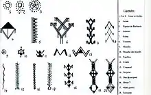C'est dans le cadre de l'analyse de ces pratiques que Makilam aborde l'écriture ésotérique des poteries et des décorations murales. Sans prétendre effectuer le recensement exhaustif des signes conventionnels qui, sous des noms[58] souvent différents selon les femmes et les villages, sont présents dans tout le Djurdjura, l'auteur, autour de huit illustrations, formule l'interprétation de quelques figures particulières.