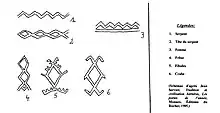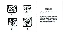 - Les triangles dont le sommet est dirigé vers le bas (la terre) « traduisent le principe primaire de la vie dans le delta fertile du corps de la femme »[60] dont ils glorifient la nature créatrice dans un sens mystique. Les traits parallèles de la partie supérieure représentent les jambes. Dans la partie inférieure du V un point noir (figure n° 1) ou un losange constitue une « porte magique ». Elle peut être figurée par un trait vertical rouge entourés de deux traits noirs (figure n° 2) ou un damier de carreaux noirs et blancs (figures n° 3 et n° 4). Selon l'auteur tous ces dessins qui portent les noms de l'œil ou de la ruche sont des allusions au sexe féminin, nid dont « sort le miel de la Vie semblable à celui des abeilles »[61]. La base du losange est parfois complété par un « M » représentant les jambes repliées. Ces représentations féminines, loin d'être érotiques ou pornographiques, « ne servent pas non plus à provoquer ou à prôner la fécondité de la femme en réduisant celle-ci à son rôle de reproductrice » : lui rappelant la fonction sacrée de la maternité, elles doivent plutôt être associées à la figure de la Grande Mère universelle[62].