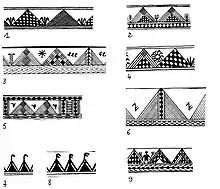 Entre les triangles l'espace est occupé par des motifs, placés à la partie inférieure ou supérieure, qui n'occupent qu'une faible partie du décor. Les premiers, désignés arbitrairement comme « terrestres », inspirés du règne végétal, évoquent des palmes ou des arbustes composés de plusieurs tiges (figures n° 1 et 2), parfois très schématisées (figure n° 3). Camps observe que devant le même motif placé en position supérieure (figure n° 5), une potière kabyle avait plutôt eu l'impression qu'il s'agissait de mains[20]. Les autres motifs, dits « aériens », évoquent oiseaux (figures n° 3 et 6) et astres (figures n° 3 et 4). D'autres vases présentent une figuration humaine (figure n° 9), ainsi que plusieurs frises, d'oiseaux, sans doute des canards et des rapaces, ou de « danseuses » (figures n° 7 et 8). Pour Gabriel Camps « la similitude est étonnante »[21] entre le « style de Tiddis » et le décor de triangle, chevrons et losanges, de la céramique modelée dans toute la Petite Kabylie (figures n° 10 et 11). « Les vases de Tiddis sont, dans toute l'acception du terme » des vases « kabyles » »[22].