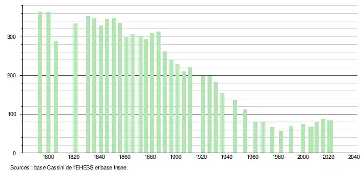 L'évolution du nombre d'habitants est connue à travers les recensements de la population effectués dans la commune depuis 1793. Pour les communes de moins de 10 000 habitants, une enquête de recensement portant sur toute la population est réalisée tous les cinq ans, les populations légales des années intermédiaires étant quant à elles estimées par interpolation ou extrapolation[32]. Pour la commune, le premier recensement exhaustif entrant dans le cadre du nouveau dispositif a été réalisé en 2005[33].