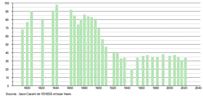 L'évolution du nombre d'habitants est connue à travers les recensements de la population effectués dans la commune depuis 1793. Pour les communes de moins de 10 000 habitants, une enquête de recensement portant sur toute la population est réalisée tous les cinq ans, les populations légales des années intermédiaires étant quant à elles estimées par interpolation ou extrapolation[15]. Pour la commune, le premier recensement exhaustif entrant dans le cadre du nouveau dispositif a été réalisé en 2006[16].