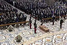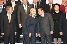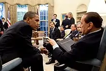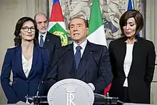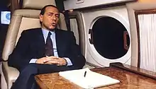 Silvio Berlusconi (/ˈsilvjo berluˈskoːni/[2] ), surnommé il Cavaliere (« le Chevalier »)[alpha 1], né le à Milan et mort le dans la même ville, est un homme d'affaires et homme d'État italien, président du Conseil des ministres de 1994 à 1995, de 2001 à 2006 et de 2008 à 2011.