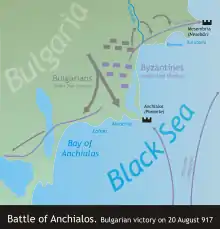 Cette même année, une armée byzantine particulièrement importante menée par Léon Phocas, fils de Nicéphore Phocas, envahit la Bulgarie, aidée de la flotte byzantine commandée par Romain Lécapène, qui fit voile vers les ports bulgares sur la mer Noire. Alors qu'elles se dirigeaient vers Mesembria (Nesebǎr), où elles devaient être rejointes par des renforts venus par bateau, les troupes de Phocas s'arrêtèrent pour se reposer près de l'Achelaos, non loin du port d'Anchialos (Pomorie)[10]. Une fois informé de cette invasion, Siméon se rua à la rencontre des Byzantins pour les intercepter et les attaqua en sortant des collines proches de l'endroit où ils se reposaient en désordre. La bataille d'Anchialos, le , fut l'une des plus grandes de l'histoire médiévale[11]. Elle vit les Bulgares mettre en déroute complète les Byzantins et tuer nombre de leurs chefs, quoique Phocas ait réussi à fuir vers Mesembria[12]. Plusieurs décennies plus tard, Léon le Diacre écrivit que « des piles d'ossements sont toujours visibles aujourd'hui à l'Achélaos, où l'armée en fuite des Byzantins fut alors tuée de façon infâme »[13].