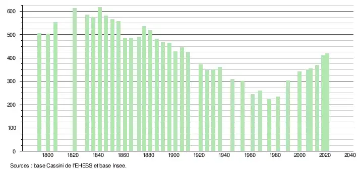 L'évolution du nombre d'habitants est connue à travers les recensements de la population effectués dans la commune depuis 1793. Pour les communes de moins de 10 000 habitants, une enquête de recensement portant sur toute la population est réalisée tous les cinq ans, les populations légales des années intermédiaires étant quant à elles estimées par interpolation ou extrapolation[41]. Pour la commune, le premier recensement exhaustif entrant dans le cadre du nouveau dispositif a été réalisé en 2008[42].