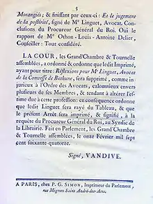 Lors de la dissolution du parlement de Maupeou en 1774, Linguet se trouve dans le camp des perdants. Il est la cible d'amères attaques professionnelles, politiques et personnelles, notamment celles de son confrère Jean-Baptiste Gerbier. Sa dernière affaire lui vaut d'être rayé du barreau par un arrêt du après dix ans d'exercice dans le droit, en raison de son attitude déloyale, ses provocations incessantes et de son mépris à l'égard de ses collègues.