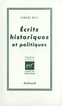 Albert Camus est l'un des premiers à avoir révélé l'importance des écrits de Simone Weil ; il considéra Simone Weil comme « le seul grand esprit de notre temps[19] », et lui rendit un hommage vibrant : il a présenté L'Enracinement comme « l'un des livres les plus lucides, les plus élevés, les plus beaux qu'on ait écrits depuis fort longtemps sur notre civilisation. […] Ce livre austère, d'une audace parfois terrible, impitoyable et en même temps admirablement mesuré, d'un christianisme authentique et très pur, est une leçon souvent amère, mais d'une rare élévation de pensée[174]. » C'est pour faire connaître la pensée de Simone Weil qu'Albert Camus obtint de fonder la collection « Espoir » aux éditions Gallimard.