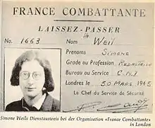 Le , elle s'embarque avec ses parents pour les États-Unis mais, refusant de rester à New York, ville qu’elle ressent comme trop confortable en ces temps de guerre, elle fait tout pour se rendre en Grande-Bretagne où elle arrive fin . Elle y travaille comme rédactrice dans les services de la France libre, où elle est chargée de rendre un rapport sur la situation morale de la France. Elle rédige plusieurs études sur la nécessaire réorganisation de la France une fois la guerre terminée, en particulier Note sur la suppression générale des partis politiques, Idées essentielles pour une nouvelle Constitution, sa très importante Étude pour une déclaration des obligations envers l'être humain, et son œuvre fondamentale, L'Enracinement ; Albert Camus et Hannah Arendt confirmeront par la suite la valeur de ce travail. Mais ce qu'elle souhaite par-dessus tout, c'est obtenir une mission pénible et dangereuse. Son projet de formation d'un corps d'infirmières de première ligne est pour elle une manière de vivre le rapport à la violence de l'Histoire sans y consentir, mais il est jugé irréalisable[52]. Soucieuse de partager les conditions de vie de la France occupée, son intransigeance dérange. Elle démissionne de l'organisation du général de Gaulle en , trois mois après son admission à l'hôpital. Elle souhaite rejoindre les réseaux de résistance sur le territoire français et est déçue par le refus de l'entourage de de Gaulle (Maurice Schumann, Jean Cavaillès, André Philip) de la laisser rejoindre ces réseaux de la résistance intérieure. Elle y risque en effet d'être rapidement capturée par la police française, identifiée comme juive puis déportée.