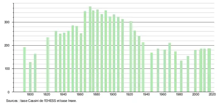 | L'évolution du nombre d'habitants est connue à travers les recensements de la population effectués dans la commune depuis 1793. Pour les communes de moins de 10 000 habitants, une enquête de recensement portant sur toute la population est réalisée tous les cinq ans, les populations légales des années intermédiaires étant quant à elles estimées par interpolation ou extrapolation[8]. Pour la commune, le premier recensement exhaustif entrant dans le cadre du nouveau dispositif a été réalisé en 2005[9]. En 2016, la commune comptait 186 habitants[Note 1], en augmentation de 0,54 % par rapport à 2010 (Landes : +4,9 %, France hors Mayotte : +1,84 %). |