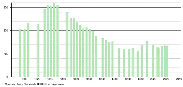 L'évolution du nombre d'habitants est connue à travers les recensements de la population effectués dans la commune depuis 1793. Pour les communes de moins de 10 000 habitants, une enquête de recensement portant sur toute la population est réalisée tous les cinq ans, les populations légales des années intermédiaires étant quant à elles estimées par interpolation ou extrapolation[17]. Pour la commune, le premier recensement exhaustif entrant dans le cadre du nouveau dispositif a été réalisé en 2008[18].