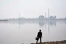 Vue aérienne du centre-ville de Sinŭiju, depuis la Chine. | |||