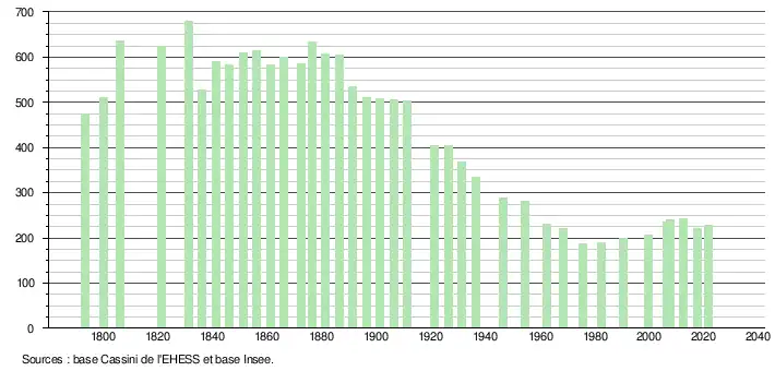 L'évolution du nombre d'habitants est connue à travers les recensements de la population effectués dans la commune depuis 1793. Pour les communes de moins de 10 000 habitants, une enquête de recensement portant sur toute la population est réalisée tous les cinq ans, les populations légales des années intermédiaires étant quant à elles estimées par interpolation ou extrapolation[20]. Pour la commune, le premier recensement exhaustif entrant dans le cadre du nouveau dispositif a été réalisé en 2007[21].