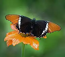 Siproeta epaphus est un grand papillon de couleur marron foncé à l'apex des ailes antérieures orange cuivré avec une bande blanche à la limite des zones orange cuivré et marron des antérieures et se poursuivant aux postérieures[4].